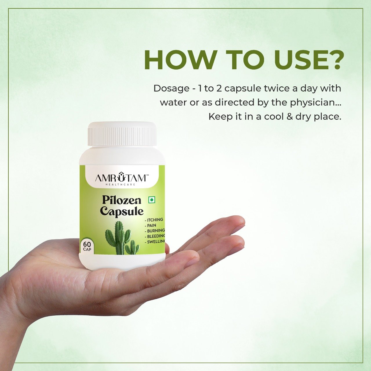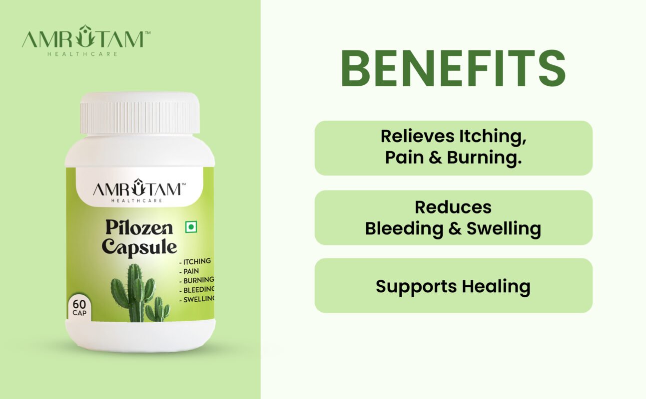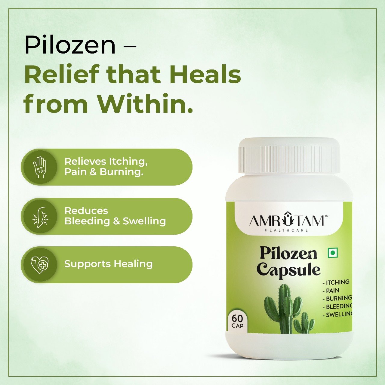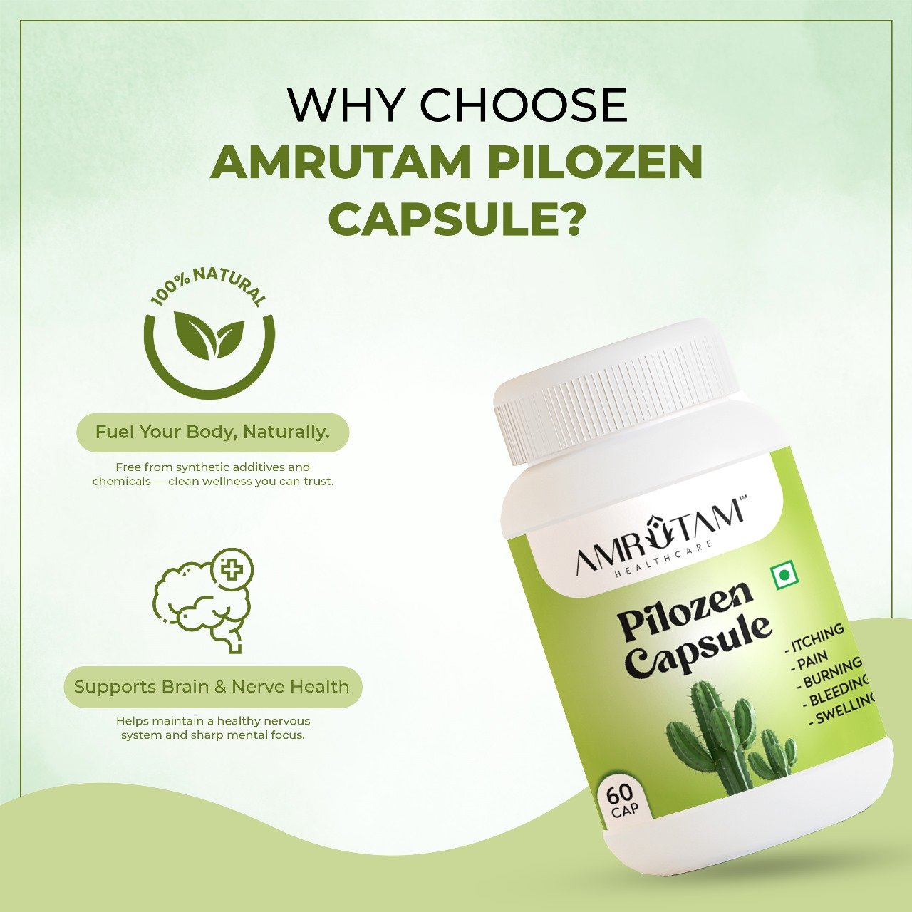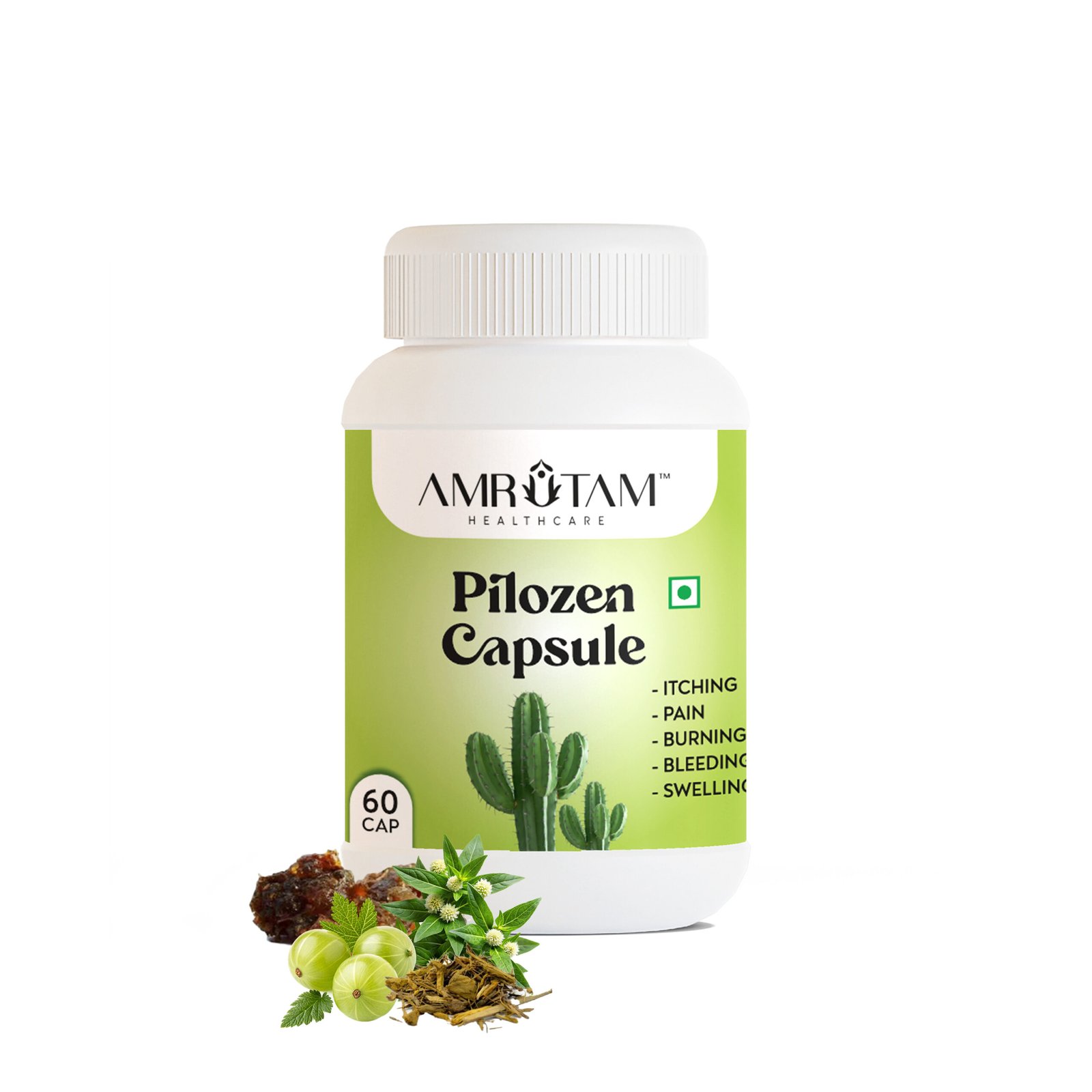 Pilozen Capsules by Amrutam Healthcare offer a potent internal solution for managing and relieving piles (hemorrhoids) and fissures. Blended with ancient Ayurvedic herbs known for their anti-inflammatory, astringent, and healing properties, these capsules work from within to reduce swelling, soothe pain, ease bowel movements, and promote healthy digestion.