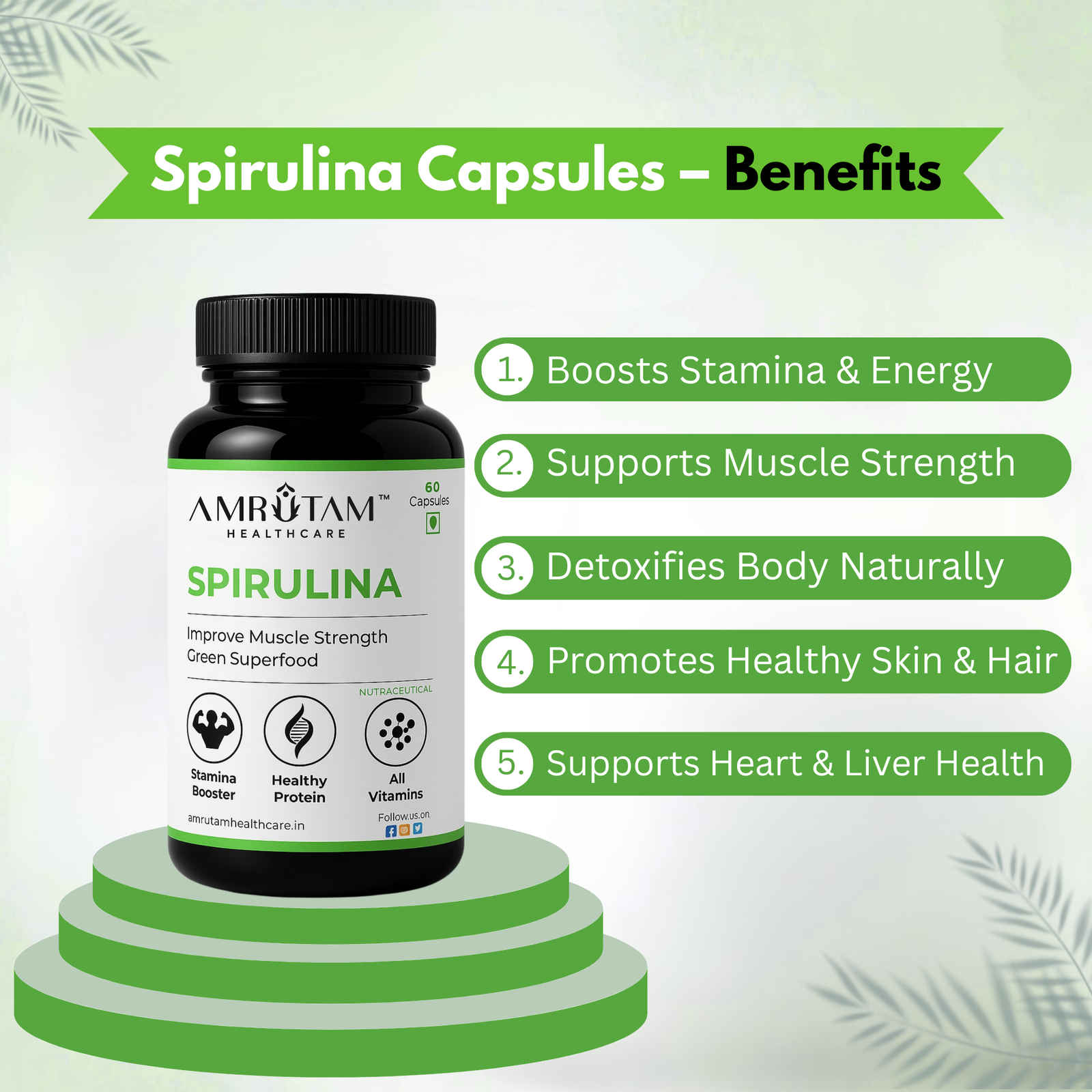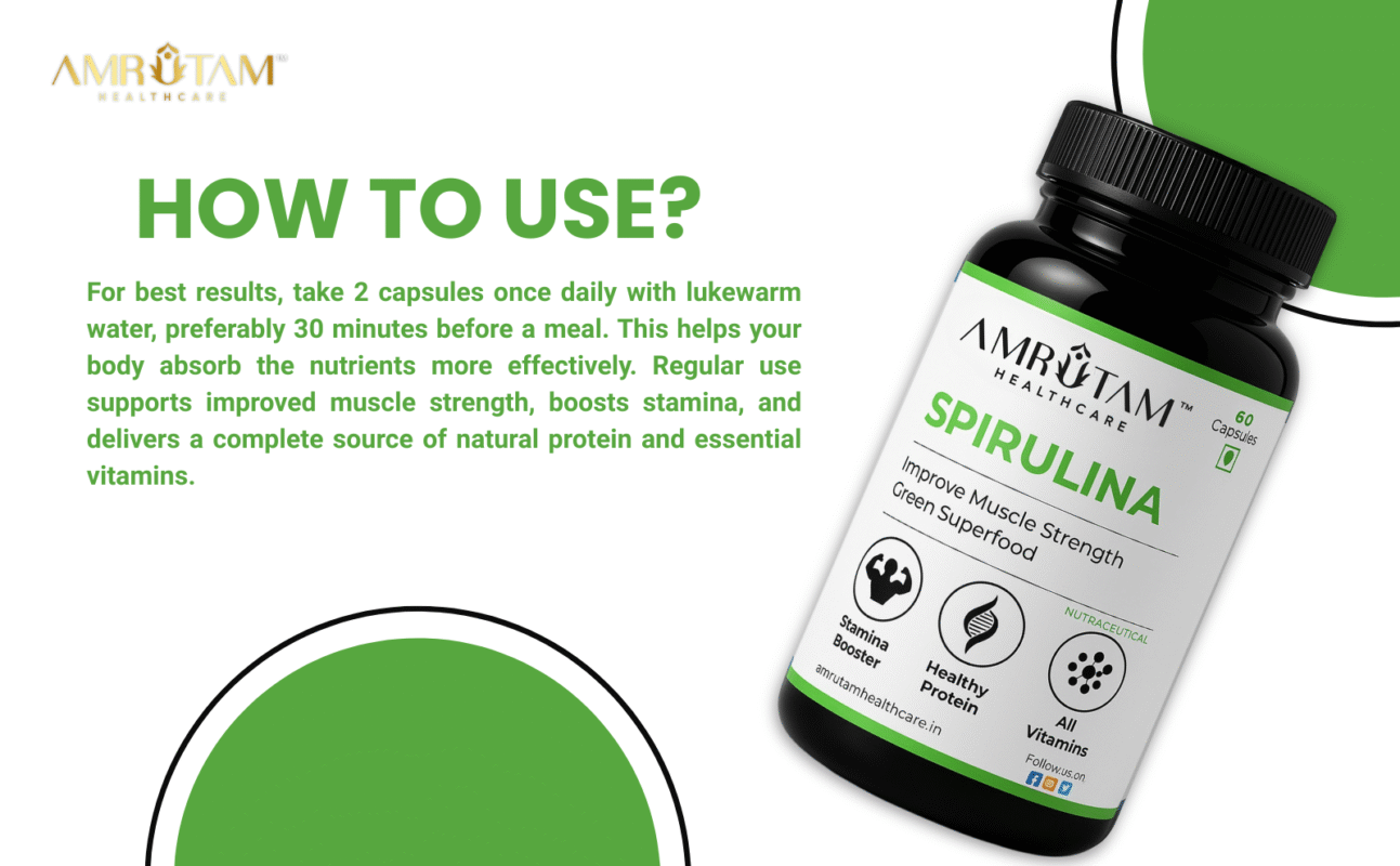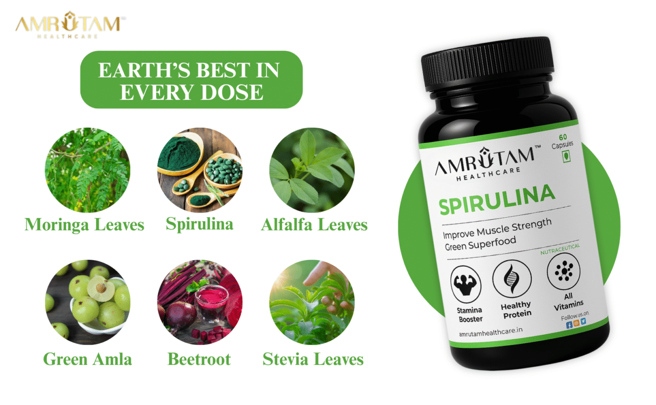 Spirulina is a nutrient-rich superfood packed with proteins, vitamins, minerals, and antioxidants. Known for its high protein content and stamina-boosting properties, it helps improve muscle strength, supports recovery, and enhances overall health. Regular consumption of Spirulina can increase energy levels, improve immunity, and promote healthy skin and hair.