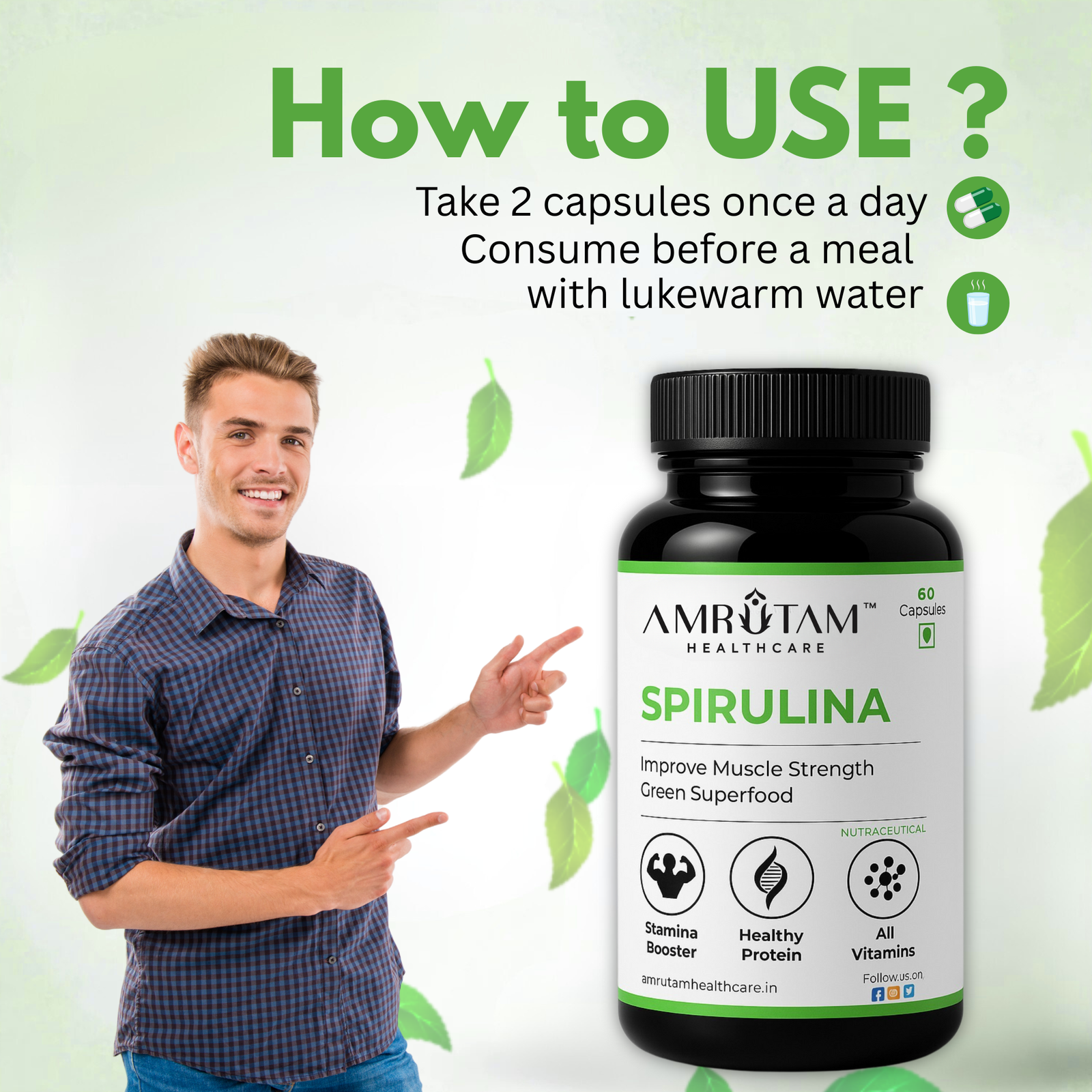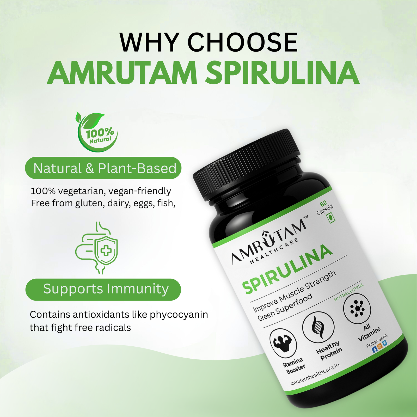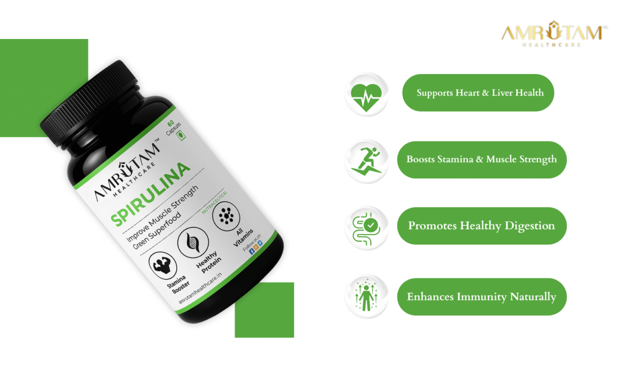 Spirulina is a nutrient-rich superfood packed with proteins, vitamins, minerals, and antioxidants. Known for its high protein content and stamina-boosting properties, it helps improve muscle strength, supports recovery, and enhances overall health. Regular consumption of Spirulina can increase energy levels, improve immunity, and promote healthy skin and hair.