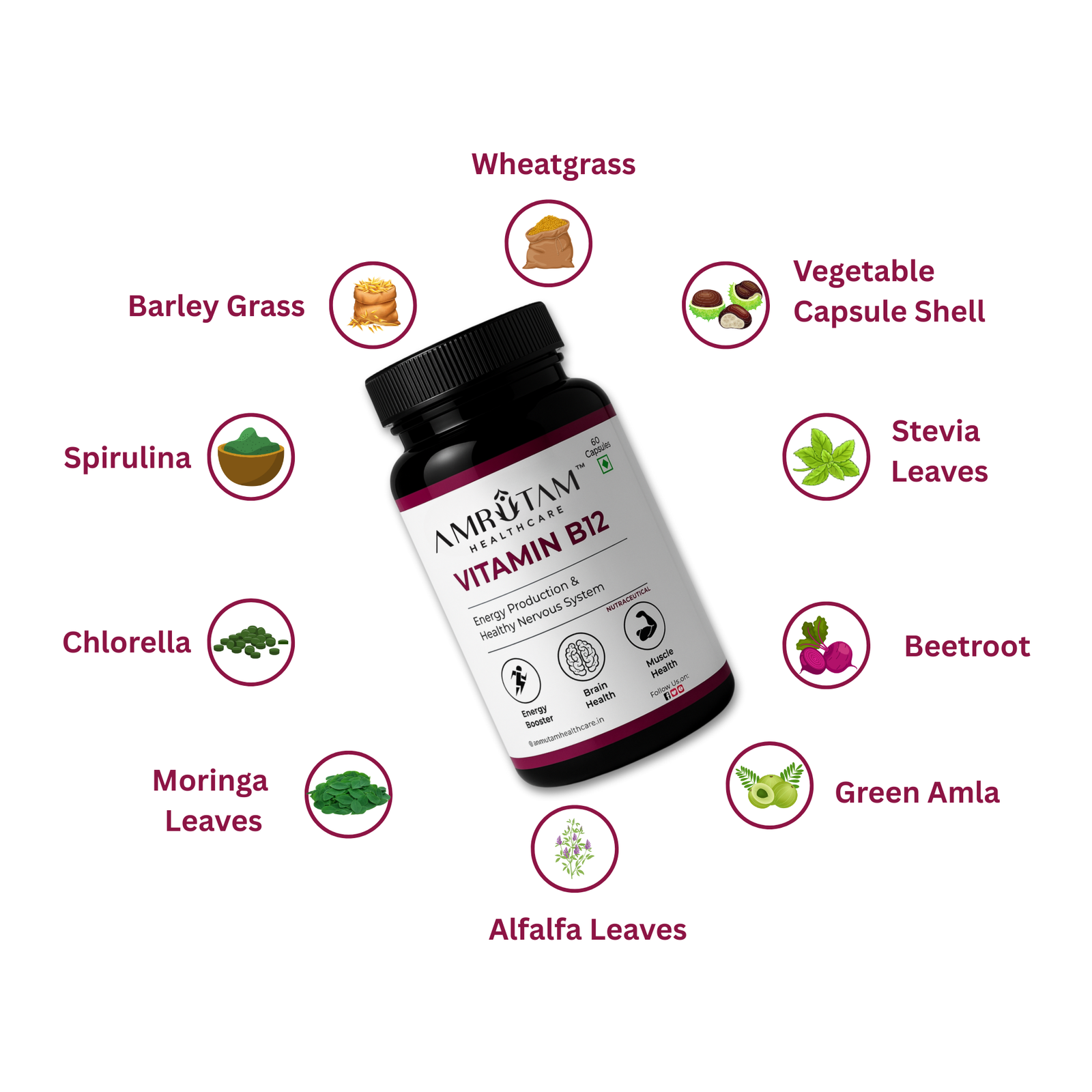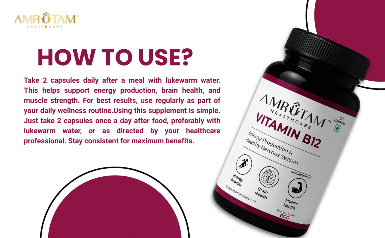 AMRUTAM Vitamin B12 is specially formulated to support energy production, promote a healthy nervous system, and enhance brain and muscle function.